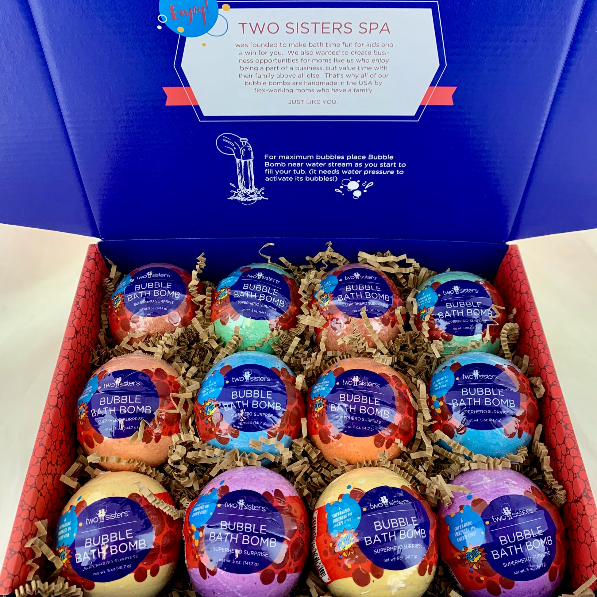Finally!   Our popular Superhero Bubble Bomb is now available as a 12 pack.  It is the perfect bath-time gift for the little superhero in your life.