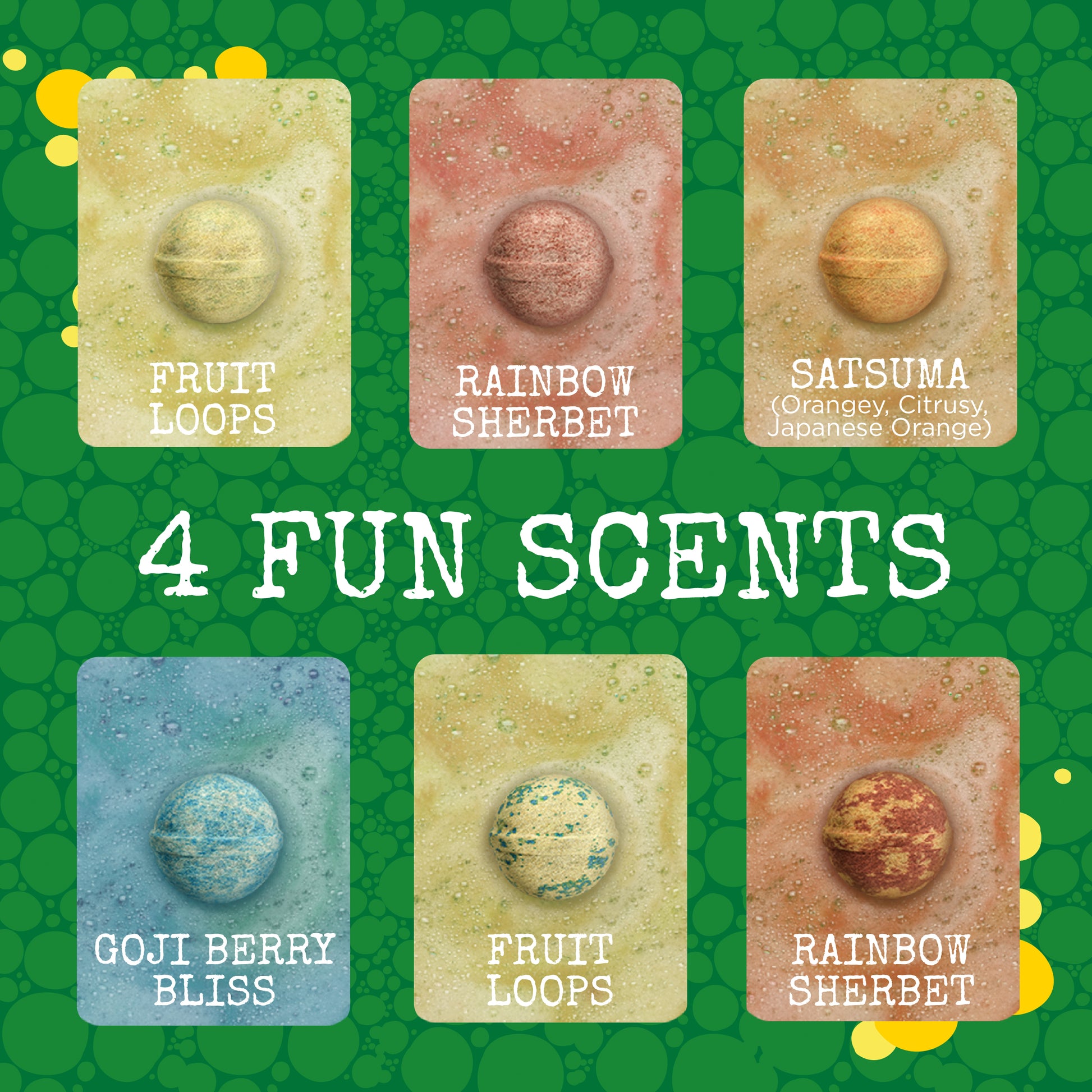 Bubble Bath Bomb Scents:Â Fruit Punch, Citrus, Fruit Loops, Berry.