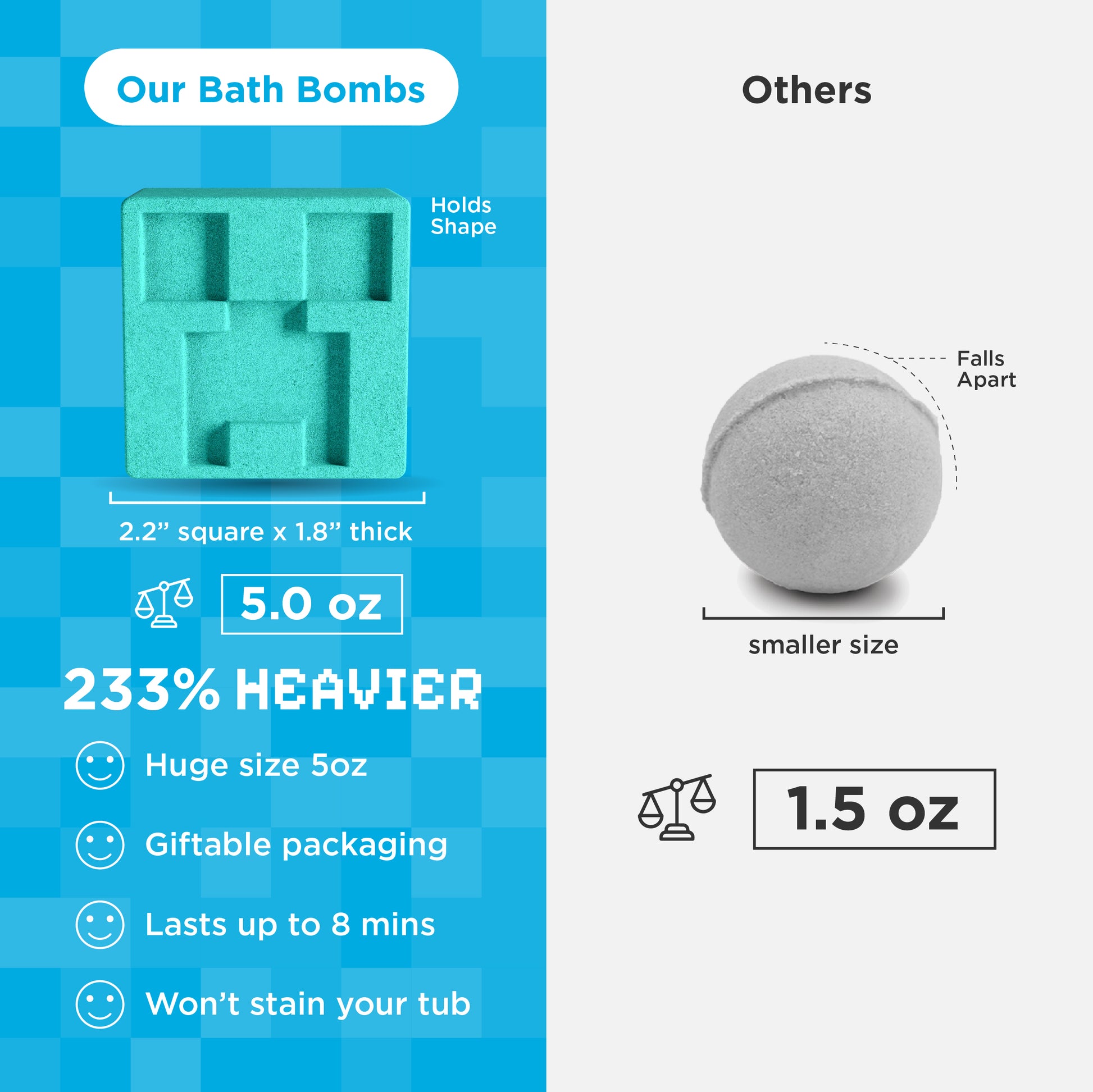 Made in the USA with a kid-friendly "SLSa" formula, our bath bombs are free from common irritants. They won’t leave color stains or rings around the tub, ensuring a fun and safe bath time.